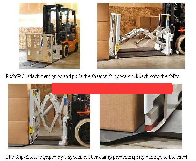 首先叉車是要經(jīng)過(guò)改裝的插齒變成一塊整體光滑的平板并且一般要求材質(zhì)304不銹鋼,然后就是要加裝一個(gè)液壓推擠裝置。推擠裝置有一個(gè)類似卡子的東西可以卡住滑托盤。